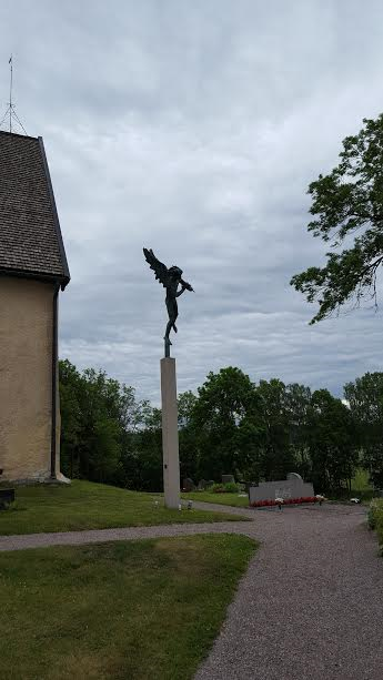 Vid kyrkans sydöstra sida finns en bronsskulptur föreställande en musicerande ängel som invigdes 4 oktober 1959. Skulpturen är en kopia av Carl Milles skulptur på Millesgården i Stockholm.