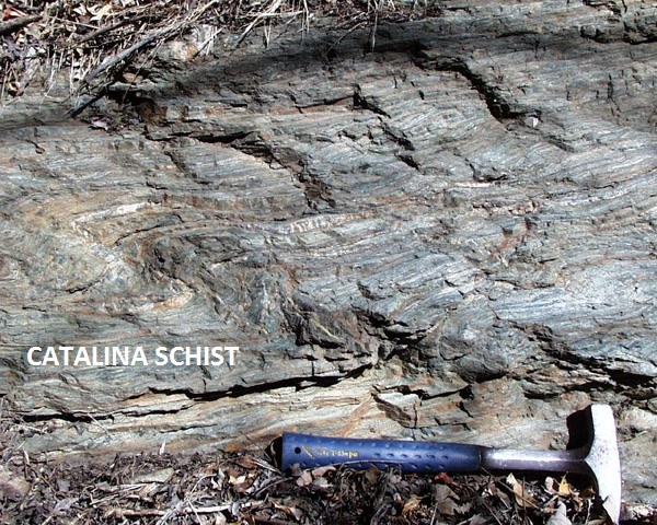 The basic story of how the island was formed, and the rocks you see around you were deposited, was assessed by Stephen Rowland in a 1984 summary paper: "...the geology of Santa Catalina Island consists of a Mesozoic metamorphic basement complex intruded and overlain by Miocene igneous rocks...[with] a few scattered deposits of Tertiary sedimentary rocks..." What this somewhat puzzling sentence is saying is that there are basically three broadly identified and locally complex types of rock that make up Catalina Island. ![]()