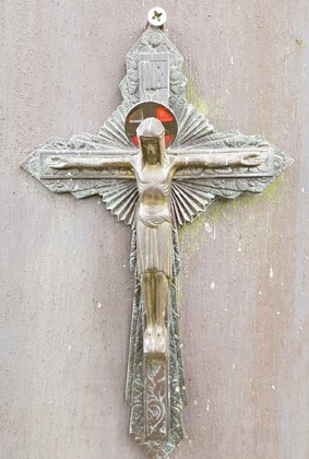 Zoek dit kruis ! Hoeveel moeren zie je aan de achterkant uitsteken waar dit kruis tegen bevestigd is ?