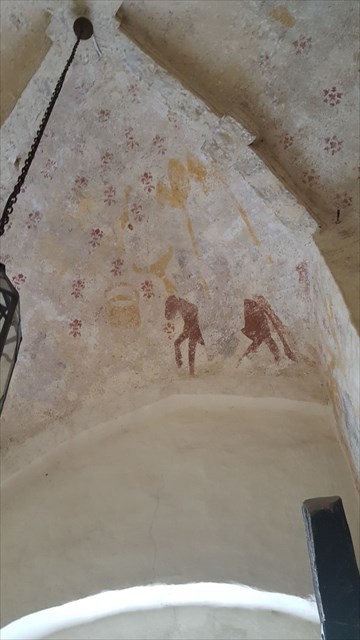 I vapenhusets tak finns kyrkans enda kalkmålningar.