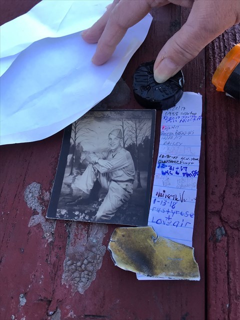 On January 14, 2018 a very special cacher, RustyRose, came to find this cache; the daughter-in-law of Captain John Murphy Jr. It marks the 4th anniversary of his wife Virginia's passing. RustyRose came equipped with a picture (below) and an actual piece of the plane. I encourage you to read RustyRose and her friend loveair's logs. They are truly the inspiration behind this cache, and its an honor to have descendants and those whose lives Captain John Murphy Jr. touched come to find this cache.
