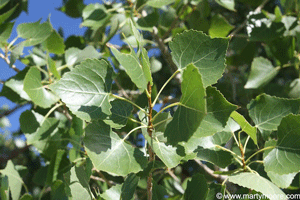 Insects have begun to eat holes in this tree's leaves. A favorite of livestock, cottonwood leaves are rich in protein, offering more amino acids than many common grains.
