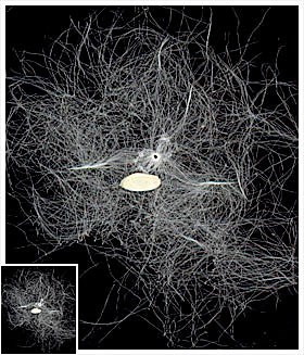 A cottonwood seed (actual size and enlarged four times) discards its parachute soon after landing. A million of these would weigh less than three pounds.