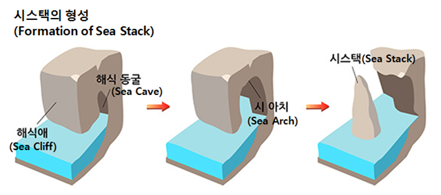 촛대바위는 시스택의 대표적인 예이다. 암석으로 이루어진 곶(串)이 파랑의 강한 침식을 받아 깎이는 과정에서 차별적으로 침식이 적게 된 단단한 부분이 파식대 위에 돌출하여 작은 바위섬을 이루게 되는데 이를 시스택이라 한다. 즉 시스택은 해식애가 파랑의 침식을 받아 후퇴할 때 차별 침식을 받아서 암석의 약한 부분은 떨어져 나가고 단단한 부분이 남아 있는 것이다. ‘sea stack’에서 stack은 스코틀랜드어로 우뚝 선 높은 바위란 뜻이다.