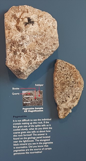 The most common sand-forming mineral is Quartz. A pure silica sand beach is said to be mature, because quartz is a very hard mineral and outlasts other rock forming minerals. Quartz is one of the principal mineral ingredients of Granite, Pegmatite and Aplite found in this area.