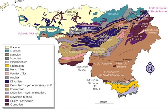 In spite of the small size of the Walloon territory, the cumulated thickness of the formations that are there would reach nearly 18 kilometers. These formations range from the Cambrian (possibly the Upper Precambrian) to the Quaternary, with only a few brief hiatus. More than half a billion years of geological archives are therefore accessible under our feet! Since our country is also a land of ancient geological culture, several names of chronostratigraphic units were forged on localities: Frasnien, Tournaisien, Viséen, Namurien, etc.