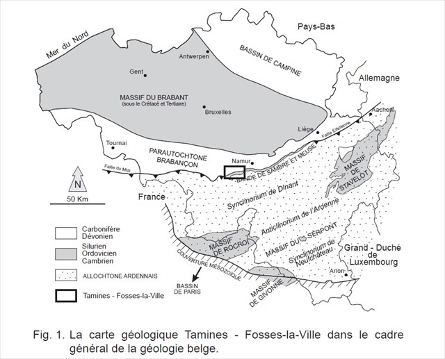 - the Carboniferous-Devonian cover of the Brabant Massif (2): This monoclinal-like structure was previously regarded as the northern flank of the "Synclinorium of Namur". This interpretation has been abandoned, in particular in the light of a seismic profile which shows that the two flanks of this "synclinorium" are composed of different tectonic units. In western Hainaut, the Devonian and Carboniferous lands, masked under Meso-Cenozoic formations, assume considerable proportions. Near Andenne, on the contrary, unity is reduced and exhibits dinantic formations. It is again developing towards the east in the region of Liège, where it is partially hidden under Mesozoic cover (north-west of Liège and Pays de Herve) ;