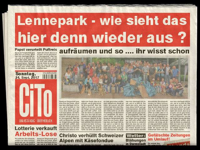 Nachdem wir in den letzten drei Jahren mit eurer tatkräftigen Hilfe erfolgreich den Hohenlimburger Lennepark von Müll und Unrat befreien konnten, soll es natürlich auch 2017 wieder ein CITO geben.