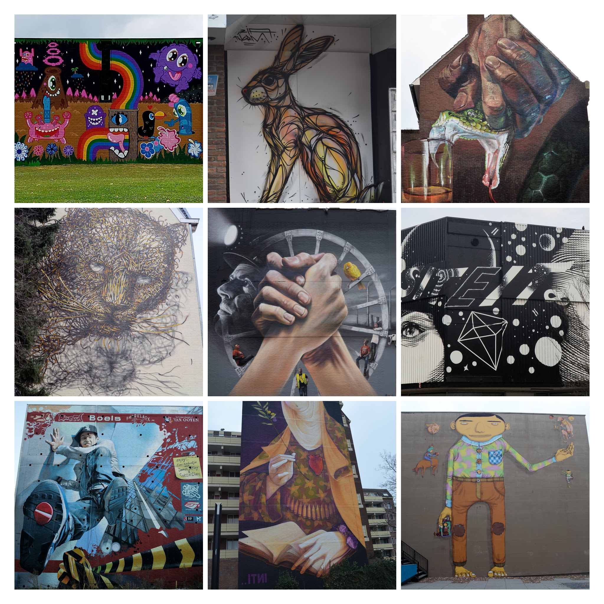 In Heerlen hebben wij een uitgebreide collectie ‘Murals’, schilderingen en graffiti-werken op muren in de stad, met name in het centrum. Kleurrijke muurschilderingen; groot en klein! De collectie wordt regelmatig aangevuld met nieuwe werken.
