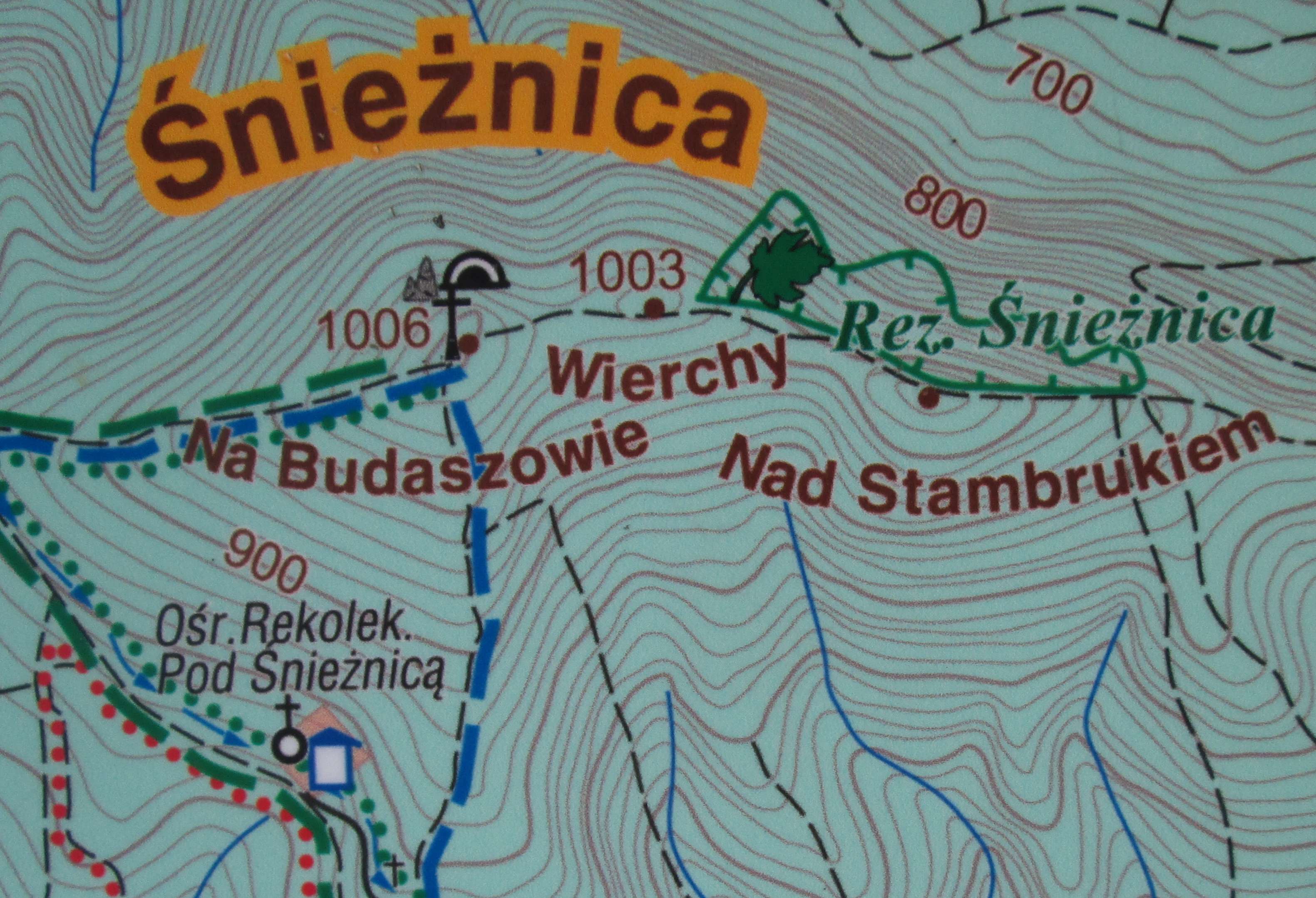 Znajdująca się w Beskidzie Wyspowym Śnieżnica (1006 m n.p.m.) posiada trzy wierzchołki. Główny, najwyższy wierzchołek nazywany jest Na Budaszowie. Dwa pozostałe, niższe i położone na wschód od głównego, to Wierchy i Nad Stambrukiem. Znajdują się na skraju rezerwatu „Śnieżnica”. Są dużo mniej uczęszczane niż główny szczyt, choć znajdują się na zielonym szlaku turystycznym prowadzącym do Dobrej.