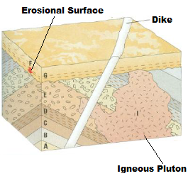Principle of Cross-cutting Relationships: whenever one geological unit intersects another, it is deduced to be more recent than the intersected one. It mainly applies to faults, dikes and igneous plutons and erosion surfaces.
