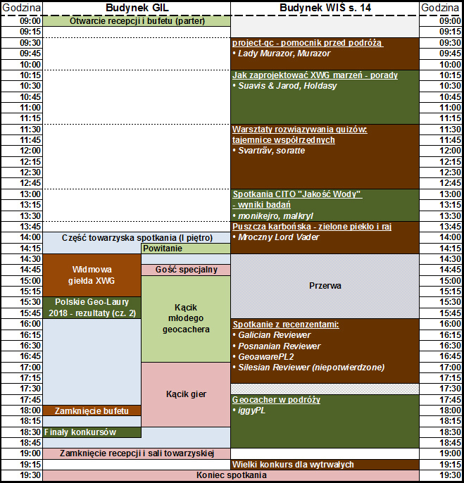 The reception will open at 9 AM at the main event coordinates - ground floor of the GIL building. There it will be possible to get the event tickets. There will be a small fee for adults that can afford it to cover a part of the organizational costs (3 PLN, or 1 USD, or 1 EUR, or 1 GBP), children tickets are free of charge. The inspection coupons of the tickets will form the official event logbook as usual. The social part of the event will be held from 2 PM to 7 PM in the GIL hall (the upper floor of the building at the main coordinates) so if you are not interested in our lectures, you are welcome to visit us in the afternoon, within these hours. We plan to have conversation tables, collectors hours, contests, kids nook, stalls with caching goodies and more.