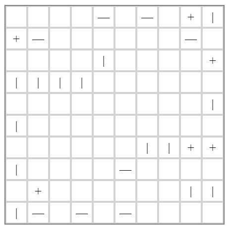 Die Regeln: Ein quadratisches Rastergitter enthält beim Tatamibari 3 Arten von Symbolen: Kreuz, horizontaler Balken, vertikaler Balken. Ziel ist es, das Rastergitter in rechteckige Bereiche in folgender Weise zu unterteilen: