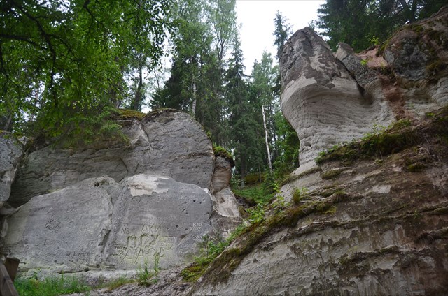 The first stage consists of a continuous, bottom almost vertical 200 m long, about 13 m high, flattened concourse, where the yellowish-white Gauja's sandstone is revealed from a water level up to 6 m high. At the outskirts, there are ductile folds, double sill, black smelter of heavy mineral concentrates, scouring surfaces and clay olives. Above them is a 6 to 7 m high third layer terraced alluvial layer. This part was created by the river Gauja to demolish the third, sandstone-covered terrace of the ancient valley.