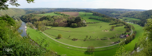 Two million years ago, the Ourthe began digging its bed on the Condroz plateau and sank gradually to its present level. The original plateau rose gently towards the Ardennes. The Ourthe, little encamped, wandered and made many meanders, leaving plenty of alluvium: pebbles rolled by the current, sands, silts. Sporadically, the Ardennes and the Condroz rose, increasing the slope. In these periods of uprising, the Ourthe actively recreated its valley. Between these periods, the Ourthe flowed more "lazily" and deposited alluvial deposits. The "terraces" are those flat terraces in the landscape that testify to the gradual and intermittent sinking of the river. Currently, the Ourthe runs 130 meters below la Roche aux Faucons. On the convex shore, the promontory of the hamlet of Ham spreads out its alluvial terraces gently sloping. The concave shore is abrupt and eroded by the lively forces of the river. At Rosière and Fêchereux, two torrential cones formed by the deposits of former tributaries have pushed the Ourthe back into the meander.