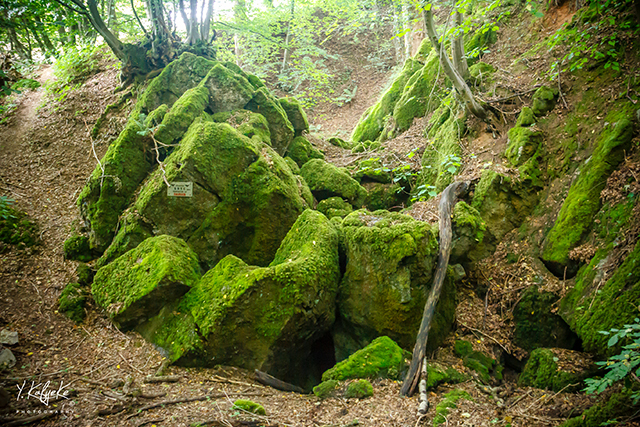 In general, rocks are eroded by rivers, sea, frost, glaciers or other means. The limestone rock of la Roche aux Faucons and the subsoil of the valley of Beauregard undergoes a particular erosion: dissolution. The water, rendered acid by the vegetation, dissolves the calcium carbonate present in the limestone. The cracks in the calcareous rock are gradually widened by acidic water, which gives rise to spectacular phenomena, such as caves or underground galleries. On a more modest scale, there are also small holes and mini-galleries dug by the water in the rock.