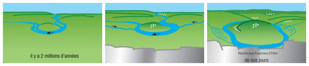 Il y a 2 millions d’années, l’Ourthe a commencé à creuser son lit sur le plateau du Condroz et s’est enfoncée progressivement jusqu’à son niveau actuel. Le plateau originel montait en pente douce vers l’Ardenne. L’Ourthe, peu encaissée, divaguait et faisait de nombreux méandres en abandonnant quantité d’alluvions : cailloux roulés par le courant, sables, limons… Sporadiquement, l’Ardenne et le Condroz se soulevèrent, augmentant la pente. Dans ces périodes de soulèvement, l’Ourthe recreusait activement sa vallée. Entre ces périodes, l’Ourthe coulait plus «paresseusement» et déposait des alluvions. Les « terrasses » sont ces replats étagés dans le paysage qui témoignent de l’enfoncement progressif et intermittent de la rivière. Actuellement, l’Ourthe coule 130 mètres en contrebas de la Roche aux Faucons. Sur la rive convexe, le promontoire du hameau de Ham étale ses terrasses alluviales en pente douce. La rive concave est abrupte et érodée par les forces vives de la rivière. A Rosière et à Fêchereux, deux cônes torrentiels formés par les dépôts d’anciens affluents ont repoussé l’Ourthe vers l’intérieur du méandre.
