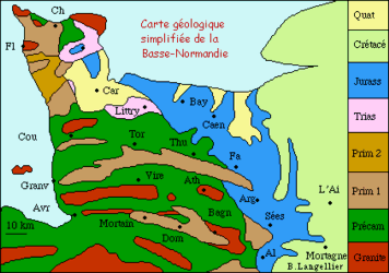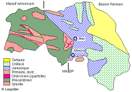 2) in the East: the Paris Basin, made up of quasi horizontal layers of the Secondary (Limestone of the plain Alençon-Sées and more to the East, Pays d'Auge and the sands of the Perche).