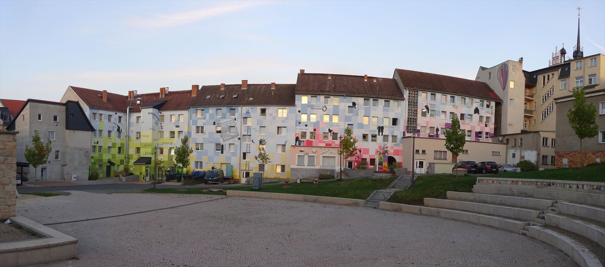 Die Fassaden in Richtung des Altstadtplatzes wurden in ein großes, historisches und zusammenhängendes Panorama verwandelt. Hier erfährt man Wissenswertes über die Stadt Pößneck und die Menschen, die hier leben oder gelebt haben. Einen besonderen Abschluss bildet der Ballon, der auf die Ballonflucht Pößnecker Bürger zu DDR Zeiten hinweist.