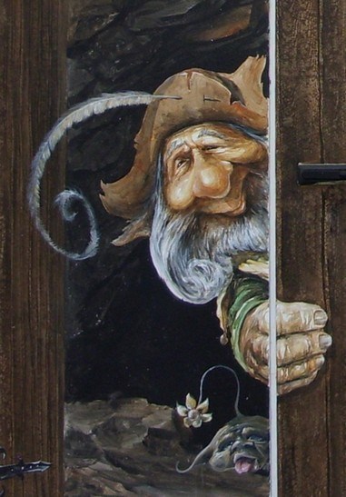 G - Die Hauptfiguren der Malerei sind natürlich die Gnome. Ganz verschieden sind sie: manche sehr adrett eingekleidet, andere sind etwas seltsam oder... gar nicht lebendig?! Wie viele Gnomengesichter 'beobachten' euch von den dunklen Stolleneingängen aus? Auch filigrane bunte Feen gibt’s hier am Haus – Zählt sie und addiert sie zur Anzahl der Gnomengesichter!