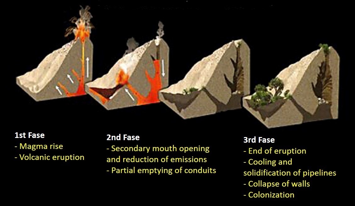 On the other hand, volcanic pits are mostly ancient vertical volcanic conduits that have been lava drained as a consequence of the arise of a new vent/eruptive center at a lower level or the decrease of lava emissions from depth leading to a lateral and/or in depth drainage of magma and the partial emptiness of the feeding conduits. As the eruption ends there is the cooling and solidification of the conduits and there might be some collapses from the walls, increasing pit´s dimensions and creating gravity deposits at the bottom of the pit.