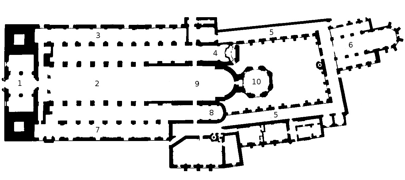 1 Vorhalle – 2 Mittelschiff – 3 Nördliches Seitenschiff – 4 Gedächtniskapelle – 5 Kreuzgang – 6 Benediktuskirche – 7 Südliches Seitenschiff – 8 Sakramentskapelle – 9 Krypta – 10 Maximilianskapelle