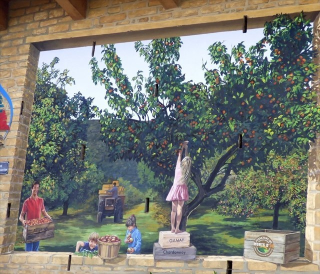 Ce premier tableau évoque le grand passé agricole de Collonges et notamment ses 108 ha de terres labourées et 142 ha de vignes en 1825 (soit plus de 40% du territoire) ! Le passant ou l’automobiliste tombe ici nez à nez avec un abricotier majestueux, suivis de poiriers, de cerisiers et de pommiers… typiques de Collonges ou des Monts d’Or.