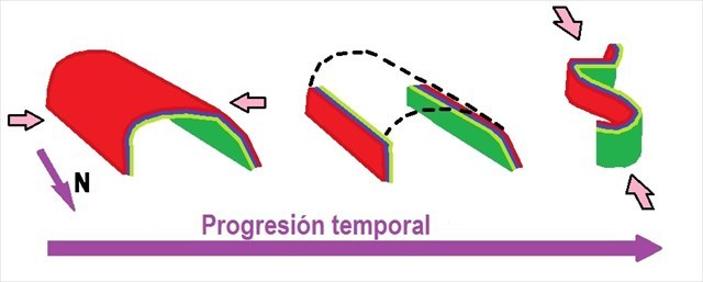 Dados estos esfuerzos producidos en direcciones ortogonales, el resultado ha sido un pliegue con forma serpenteante, característica de esta zona. El siguiente esquema muestra el proceso en sus tres etapas fundamentales: