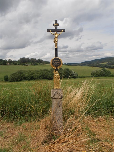 This cross is placed hundred metres from the end of the village in direction to Zvotoky (or Samoty u Škůdry). If you come to a waypoint near the cross, you will get a pretty beautiful view on these slopes and hills. Generally this countryside is perfect for taking a pleasure in views so do not hesitate to park on the main parking (see the cache GC75XHV – waypoint Parking in the village) and walk for the whole serie of caches.