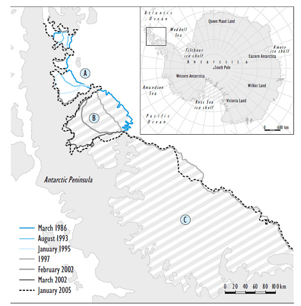 Este tipo de desintegración es muy inusual, ya que generalmente las barreras de hielo pierden masa por el desprendimiento de icebergs, fracturándose y fundiéndose sus superficies superiores e inferiores. Estas desintegraciones no estarían vinculadas a ningún calentamiento climático en la península Antártica.