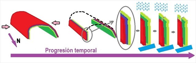 Una vez el flanco del pliegue quedó vertical, se inició un doble proceso de erosión: