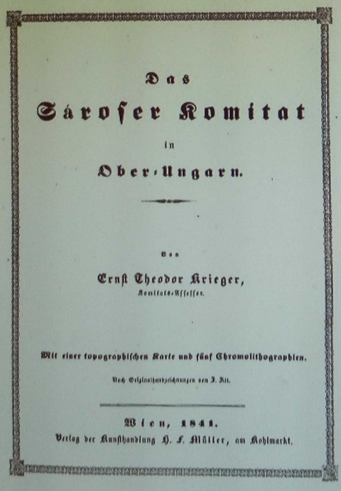 Ernest Tomas Teodor Krieger {*1798, † 1855}. Bol synom Ch.E. Kriegera, Dr. z druhého manželstva /prvá manželka Sofia Hüber zomrela/. Zvolil si úradnícku dráhu. Po absolvovaní štúdia na prešovskom evanjelickom kolégiu pracoval na rôznych úrovniach stoličnej správy. Zastával významné funkcie – okrem iných bol súdnym prísediacim šarišskej a abovskej stolice a asesorom šarišskej stolice. Vyjadroval sa k viacerým žiadosťam adresovaným mestskému magistrátu v Prešove. Vo voľnom čase sa venoval hospodáreniu na svojom majetku, písaniu poézie, ale najmä svojej najväčšej záľube – prírode. V rokoch 1825 – 1836 svoje pozorovania publikoval formou odborných článkov najmä vo viedenských Gemeinnütze Blatter. Aj keďsa skúmaniu prírody venoval len ako amatér vo voľnom čase, viaceré učené spoločnosti si ho zvolili za svojho korešpondujúceho člena. Prírode a zaujímavostiam rodného kraja venoval aj svoju z dnešného pohľadu najzaujímavejšiu prácu “Šarišská stolica v Hornom Uhorsku.” V origináli “Das Sároser Komitat in Ober Ungarn” vyšla vo Viedni v roku 1841. Rozsahom neveľká publikácia je rozčlenená do viacerých kapitol. Je považovaná za prvú vlastivednú monografiu šarišskej župy. V úvodných častiach je opísaná Šarišská stolica všeobecne, jej hranice, výraznejšie cesty, geologická stavba, vodstvo, fauna a flóra. Po informáciách z Prešova ako centra šarišskej župy (v tom čase mal 8 890 obyvateľov) nasledujú kapitoly o pozoruhodných jaskyniach, prírodných útvaroch, opis ružinských jaskýň či Lačnovského kaňonu. V diele sa spomínajú Lipovce, Kalvária, Cemjata, Išľa, Šebeš či Kelemeš / Šebastová či Ľubotice / ako aj mnoho ďalších obcí a zaujímavých miest. Ernest Tomas Teodor Krieger zomrel 7. augusta 1855 vo svojom rodnom dome v Prešove.