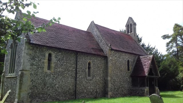 St Mary's is constructed in Flint with stone dressings, and has a tiled roof. Its plan consists of a nave with a south aisle chancel and a north porch. At the west end of the nave gable is a bellcote. The porch is timber-framed on a flint base, with a tiled roof.