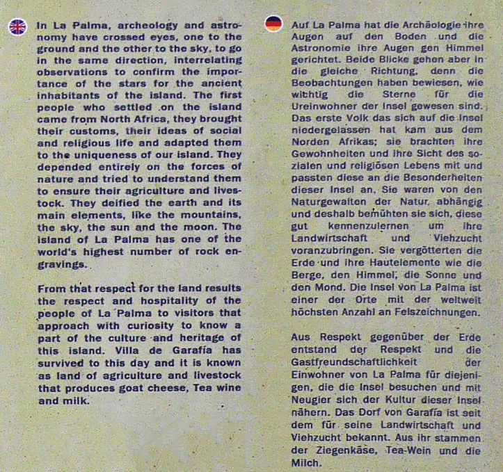 En La Palma, la arqueología y la astronomía han cruzado las miradas, unos al suelo y otros al cielo, para coincidir en una misma dirección, interrelacionando las observaciones hasta confirmar la importancia de los astros entre los antiguos habitantes de la isla. El primer pueblo que se asentó en la isla procedía del Norte de África; trajeron sus costumbres, sus ideas de vida social y religiosa, adaptándolas a la singularidad de nuestra isla. Dependían absolutamente de las fuerzas de la naturaleza por lo que se esforzaron en conocerla, para así, asegurar su sustento agrícola y ganadero. Divinizaron la tierra y sus principales elementos, como las montañas, el cielo, el sol y la luna. Es de destacar, que la isla de La Palma, es uno de los lugares del mundo con mayor número de grabados rupestres.