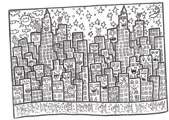 Ihr seht hier ein von mir selbst gemaltes Bild a la James Rizzi in schwarz weiß. Wie schon bei meinem anderen Cache „Radiant Baby“ sind auch hier ein paar seiner berühmten Figuren dargestellt.