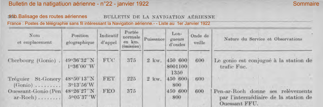 La station Ouessant-Gonio de Penn Ar Roch dans le Bulletin de la navigation aérienne de 1922.