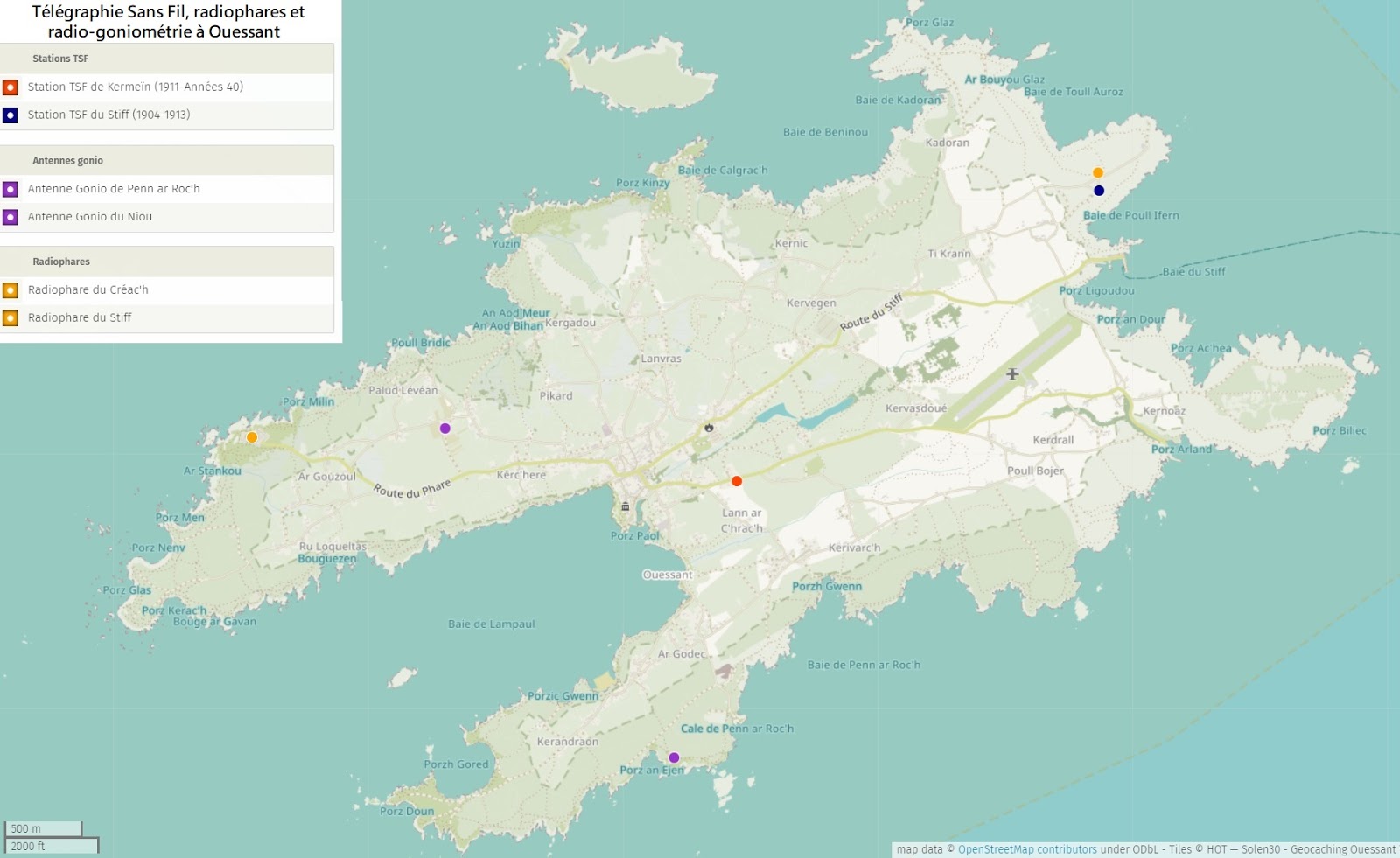 Carte des infrastructure de radiotélégraphie et radiogoniométrie à Ouessant