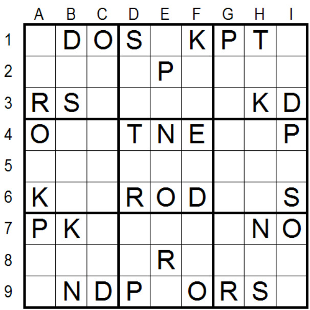 Ihr sollt die BUCHSTABEN DENKSPORT so in die leeren Felder eintragen, dass in jeder Zeile und in jeder Spalte sowie in jedem der Quadrate, die aus 3x3 Kästchen bestehen, alle BUCHSTABEN genau einmal vorkommen.
