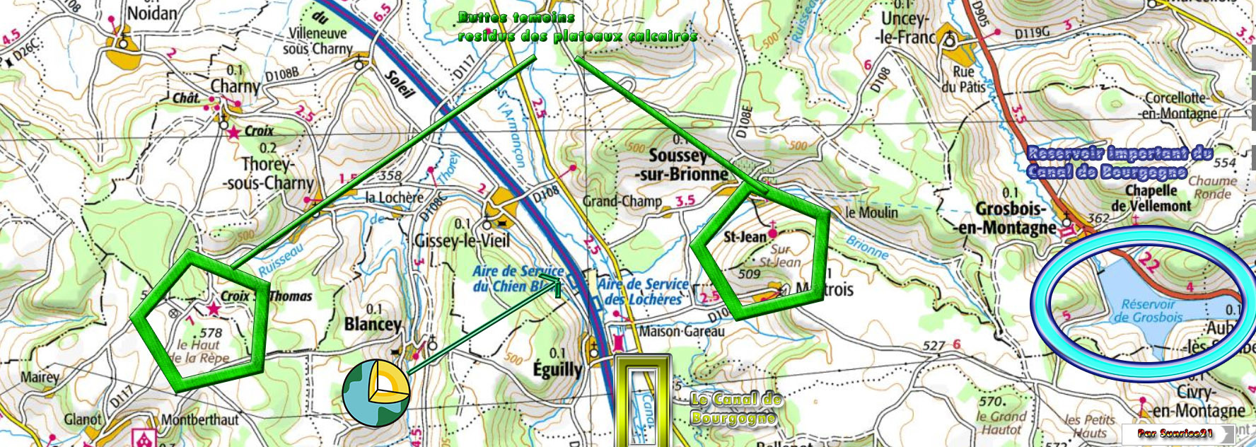 Initial natural data have been profoundly modified by numerous developments over the centuries, as the crossing of the Seuil de Bourgogne has imposed multiple works, road, motorway, river and railway