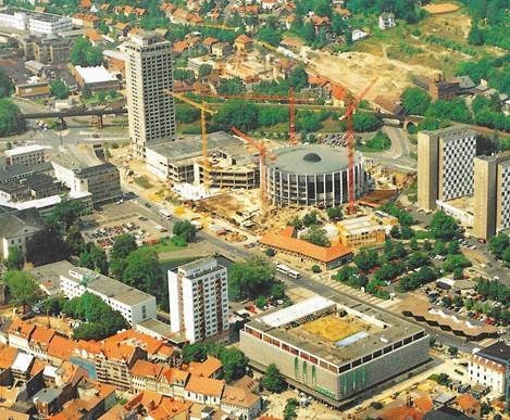 Kurz nach der politischen Wende wurde der gesamte Gebäudekomplex grundlegend umgebaut. Hier eine Luftaufnahme mit dem bereits entkernten Hochhaus.