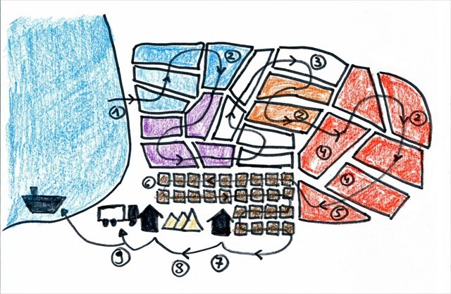 Après avoir été pompée de la mer (1), l’eau salée parcourt des dizaines de kilomètres de partènenemts ou surfaces préparatoires au cours desquels elle va perdre 90% d’eau et se saturer en NaCl grâce à l’action du Mistral et du soleil.