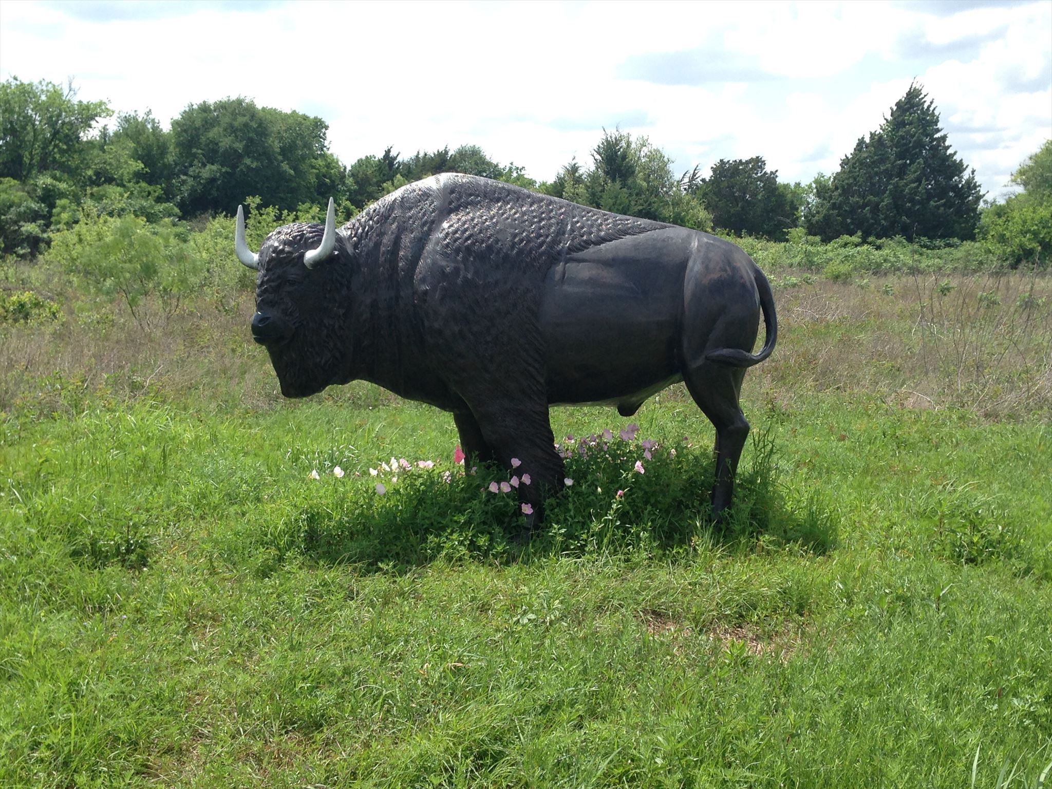 This is a simple 2-stage puzzle located in Ennis, TX. on the east shore of Lake Clark. The Kachina Prairie is a 22-acre patch of undisturbed native prairie. This park is one of the few remaining remnants of Blackland Prairie in Texas. It has a gravel parking area adjacent to a sign that lists several groups focused on preservation, wildflower types, and major animals found in Texas. There is also a map depicting the park trails, park benches, and a bison statue.