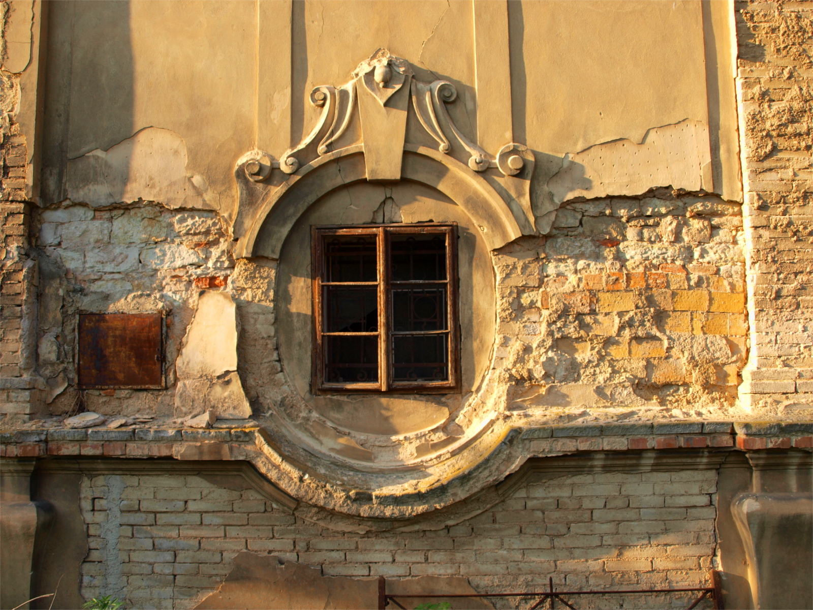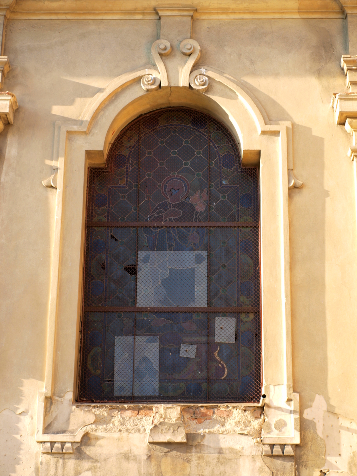 Historický snímek kostela, fotky detailů na kostele a socha sv. Floriána