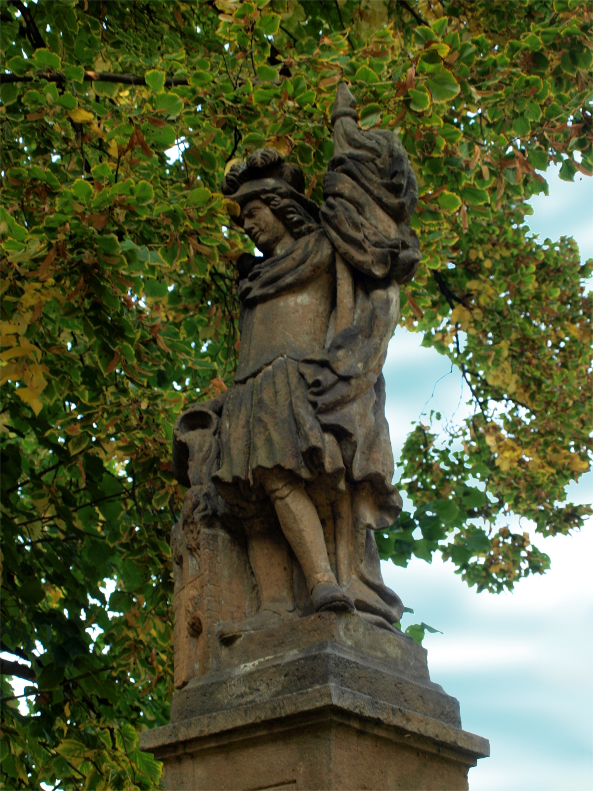 Doslova pár kroků od kostelní věže můžete na toskánském sloupu nalézt sochu sedící Panny Marie z doby okolo roku 1700. Nalevo od ní se nachází umělohmotná tabulka, na které je poznamenán rok ve formátu EFGH.