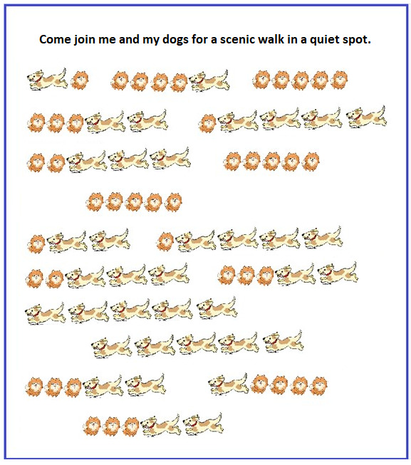 I like to join my dog-loving friend for scenic walks. He sent me this note. Is it just a bunch of pictures of his cute dogs, or something more?