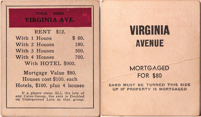 Virginia Avenue is the last of the pink properties, and, as such, has slightly higher rents and prices than St. Charles Place and States Avenue. In Atlantic City, Virginia Avenue was the favorite place of the famous and nearly-famous.