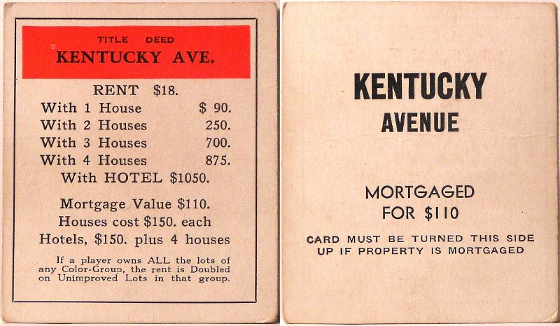 Kentucky Avenue is the first of the Red Properties. It has higher risk but higher potential return than the Oranges, and can be key to winning.