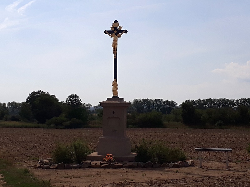 Kříž stojí v polích u trati nedaleko Drnovic. Rodina, která jej v roce 1862 nechala postavit, byla zřejmě na tehdejší dobu hodně bohatá, o čemž svědčí hodně zlacených prvků. V současné době byl kříž již značně zchátralý, a proto jej obec nechala v létě 2016 zrestaurovat. Byl také posunutý směrem k polní cestě, protože zemědělské stroje jej často poškozovaly během prací na poli.