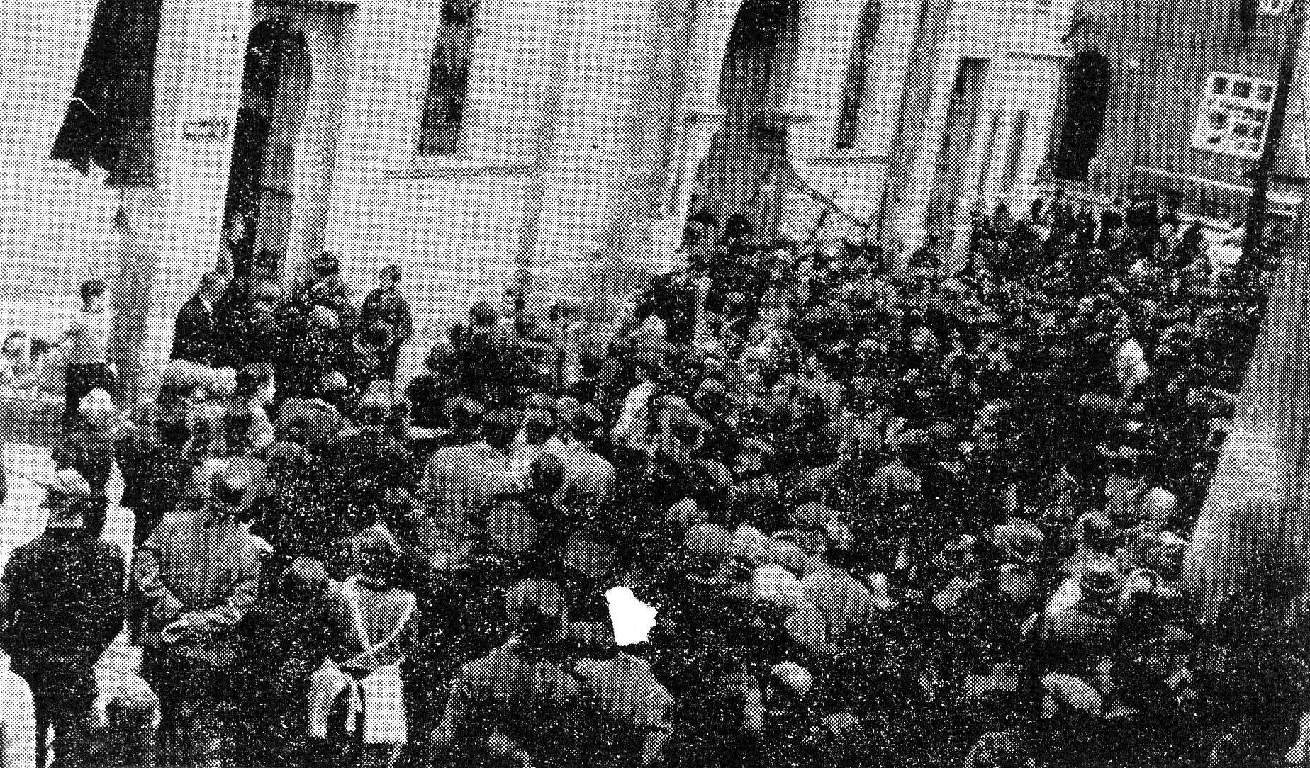 Dav "lidí" před synagogou při Křišťálové noci v Žatci