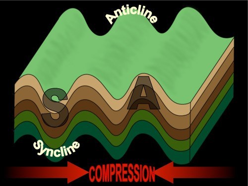 Anticlines and Synclines are the up and down folds that usually occur together and are caused by compressional stress.Anticlines are folds in which each half of the fold dips away from the crest. Synclines are folds in which each half of the fold dips toward the trough of the fold. You can remember the difference by noting that anticlines form an “A” shape, and synclines form the bottom of an “S.” In anticlines, as seen on the ground, the oldest rocks are in the centre of the fold. In synclines, the youngest rocks are in the centre of the fold.